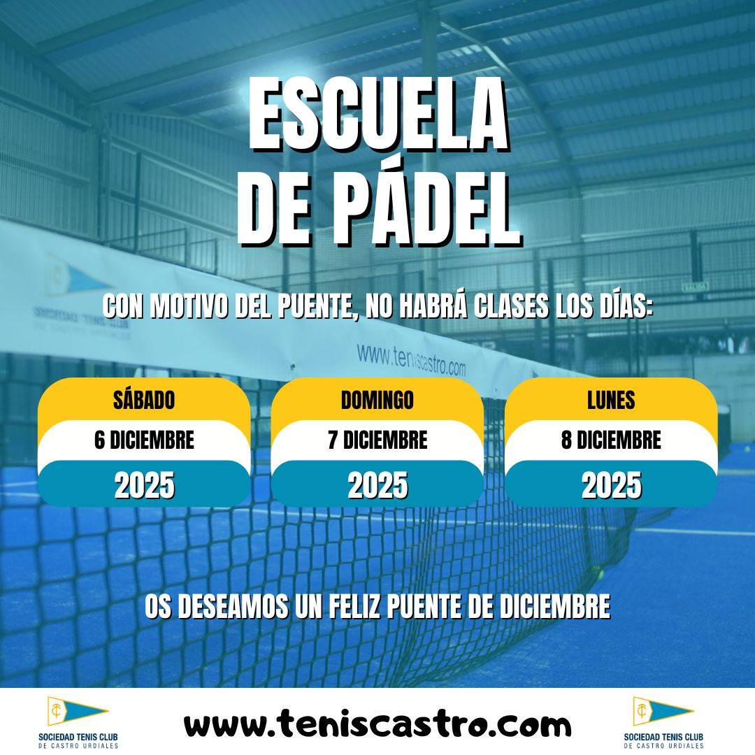 Informamos a todos los socios/as que no habrá clases de pádel los días sábado 6, domingo 7 y lunes 8 de diciembre, con motivo del puente.
